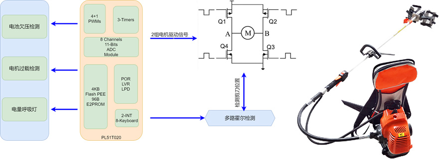 本方案采用PL51T020芯片,芯片內(nèi)集成4KB-flash,128Byte真EEPROM,11Bit-ADC, 4路PWM等豐富資源。系統(tǒng)利用PL51T020偏上集成諸多資源,實(shí)現(xiàn)剪刀機(jī)開關(guān)信號(hào),位置信號(hào)等檢測(cè),電機(jī)過載異常檢測(cè);電路簡潔成本可控。