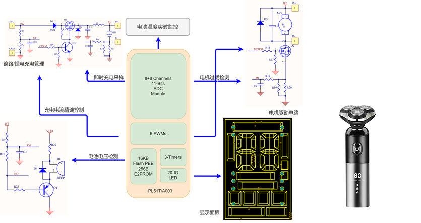 This scheme adopts pl51t / a003 chip, which integrates 16kb flash, 256byte true EEPROM, 11bit ADC, 6-channel PWM and other rich resources; The scheme software realizes nickel chromium lithium battery charging management, overshoot and discharge protection; Abnormal anti burning machine functions such as motor drive and motor jamming; Interview dynamic display, use time, remaining power evaluation and other functions.