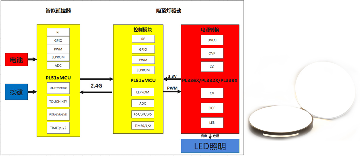 節能綠色環保越來越受消費者重視, LED作為新的照明產品,滿足現今消費者需求,而LED智能照明也成為家居日常不可或缺產品,使用PL51WT020設計的吸頂燈方案,實現燈光的亮度、顏色、定時關燈等功能無線控制,遙控器做成隨意貼方式,可以安裝在家居環境內任意位置,不受方向障礙物等影響控制效果。